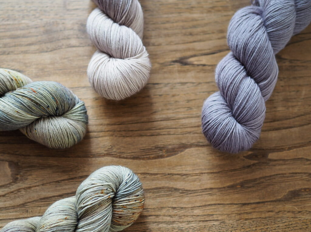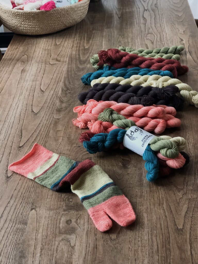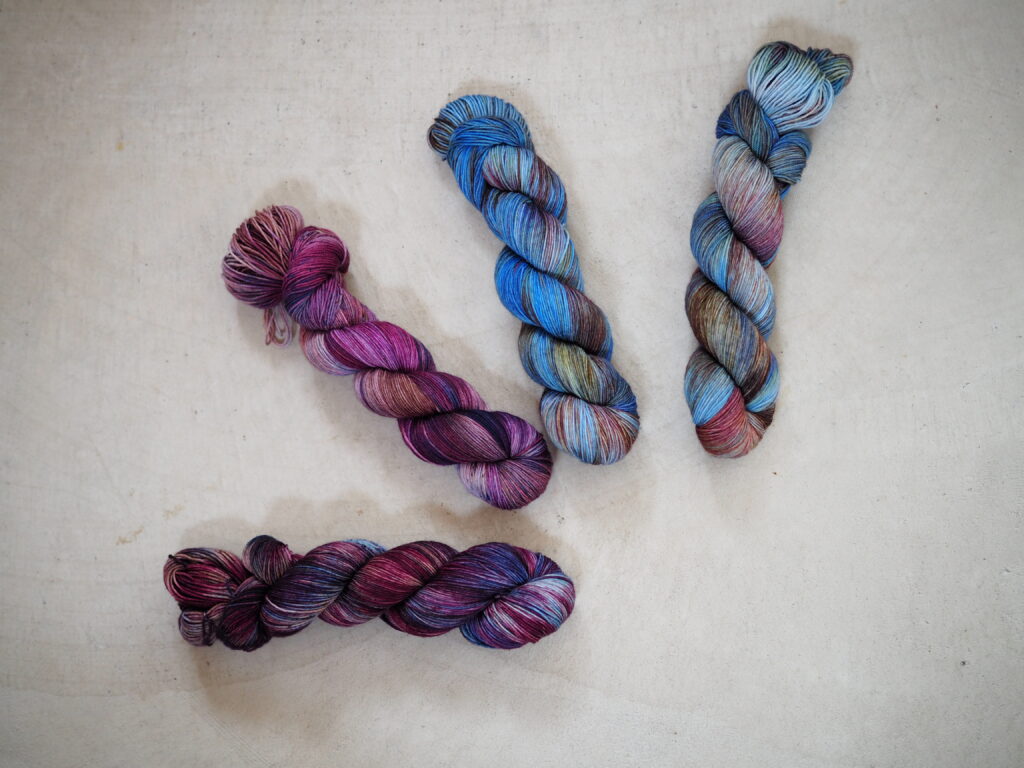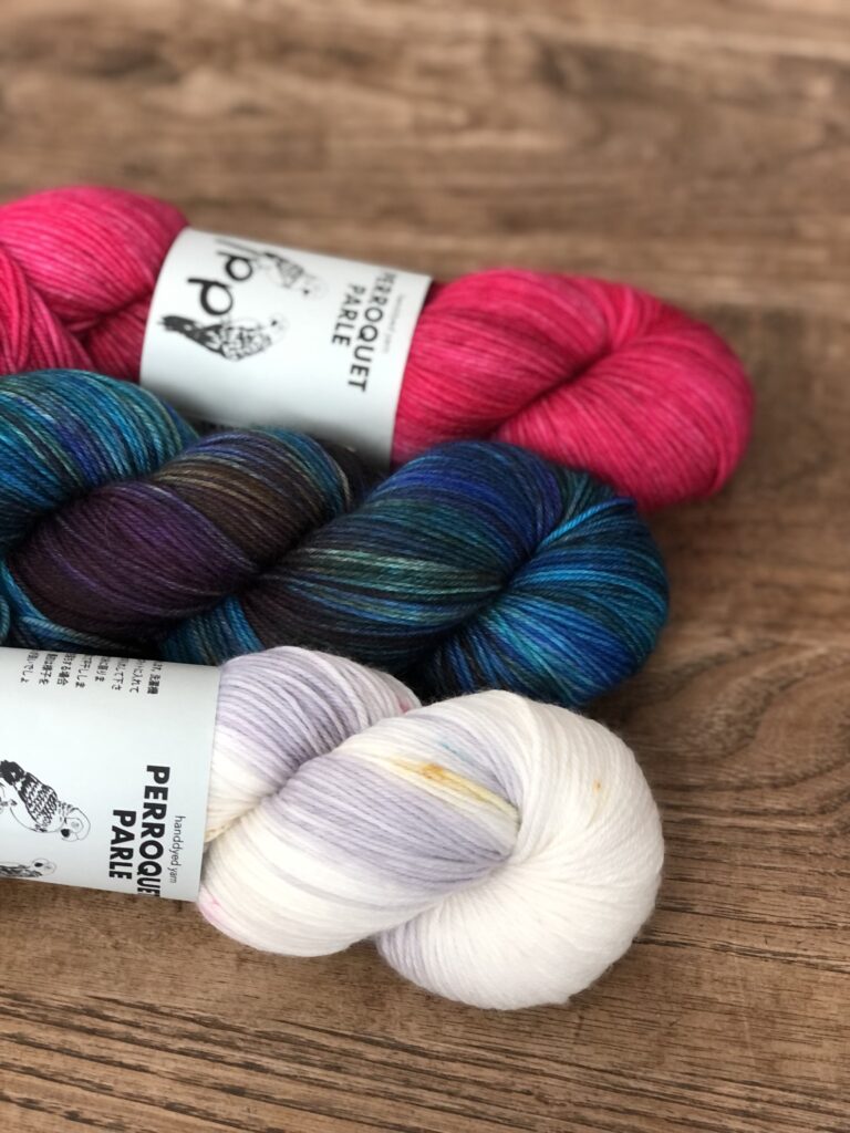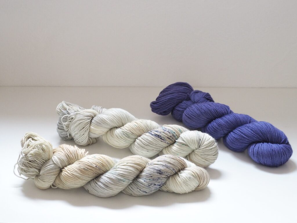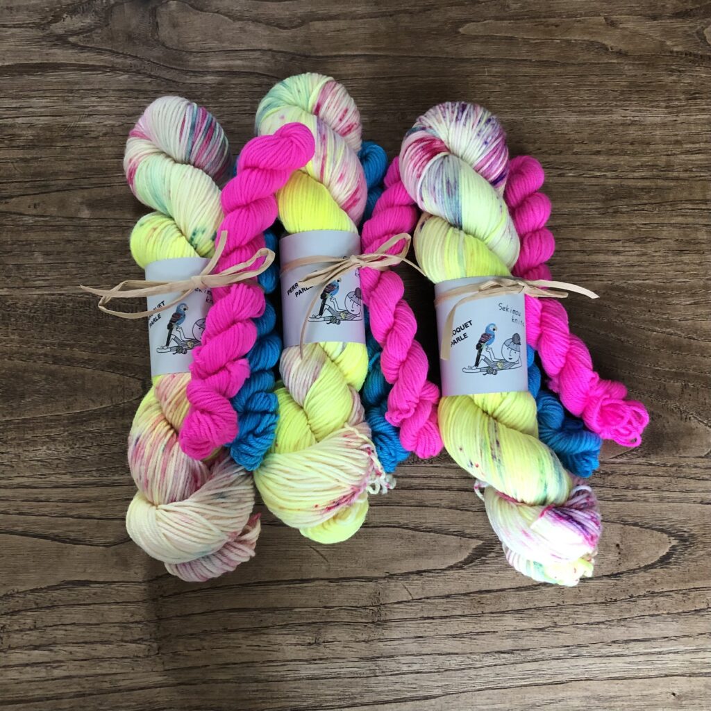 こちらはKaoさんのパターンのために作った糸セットです。ミニかせを好きなように合わせていくのがとても楽しいので、ぜひ編んでいただきたいです!