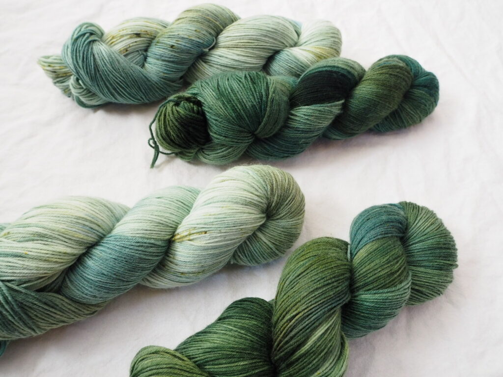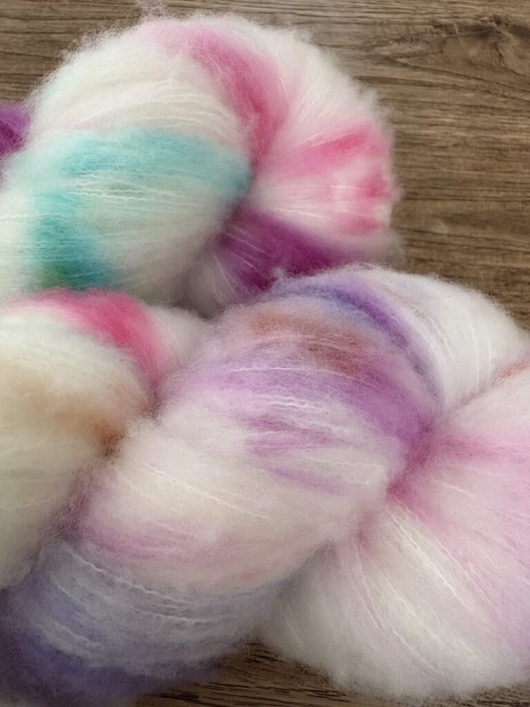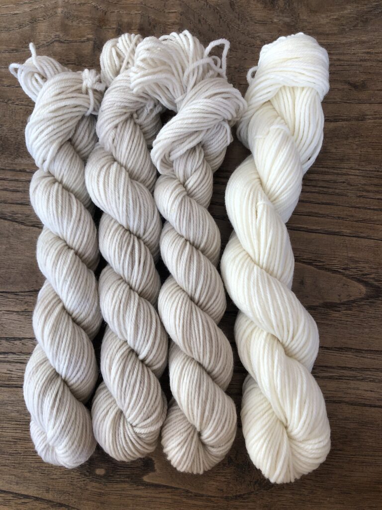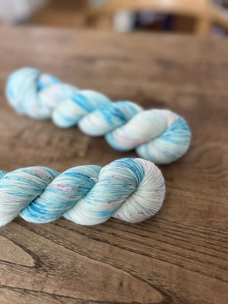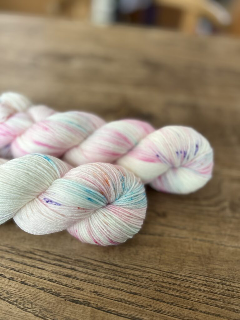 Bluefaced Leicester という種類の羊毛です。毛足が長めで少しカサッとしています。BFLは丈夫なのでナイロンの入っていない糸で靴下を編むならこちらをお勧めします。毛玉もできにくいのもポイントです。